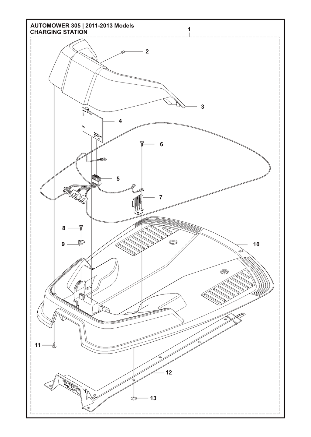Hier finden Sie alle Ersatzteile für Ihren Husqvarna Automower® 305 der Modelljahre 2011-2013, die in der Ladestation verbaut sind.
